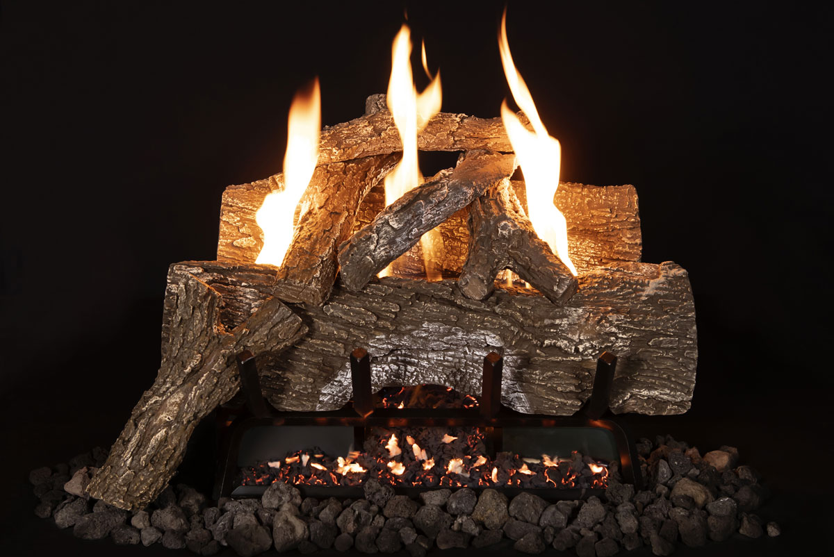 Grand Canyon Gas Logs vent less gas log systems feature our Vulcan Burner & Boutique style logs. The Vulcan burner is available in Natural Gas or Liquid Propane, available with 3 different valve options & designed to be installed with any of our Boutique style logs. The burner is also duly listed for vented & vent less applications. The valve systems feature an exceptional turn down from 37K–19K BTU’s on the electronic & variable valves. The grate also features a natural wood style looking grate, enhanced deep ember bed & large lava rock to soften the embers edge. The 18” burner is available with our 18” logs & the 24” burner can be installed with 24” or 30” logs. The boutique style logs are available in Weathered Oak, Red Oak, Split Oak or Aspen Birch. All of our logs are hand picked, hand painted & feature a ceramic refractory to help radiate more heat.